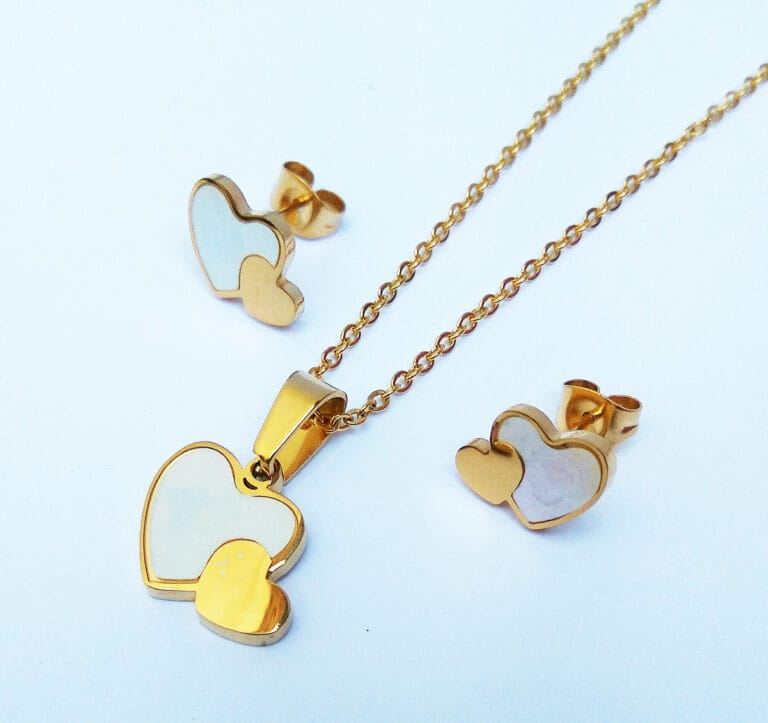 Set Collar y Aretes Mujer mini corazon Acero bañado oro 18k – Blanco